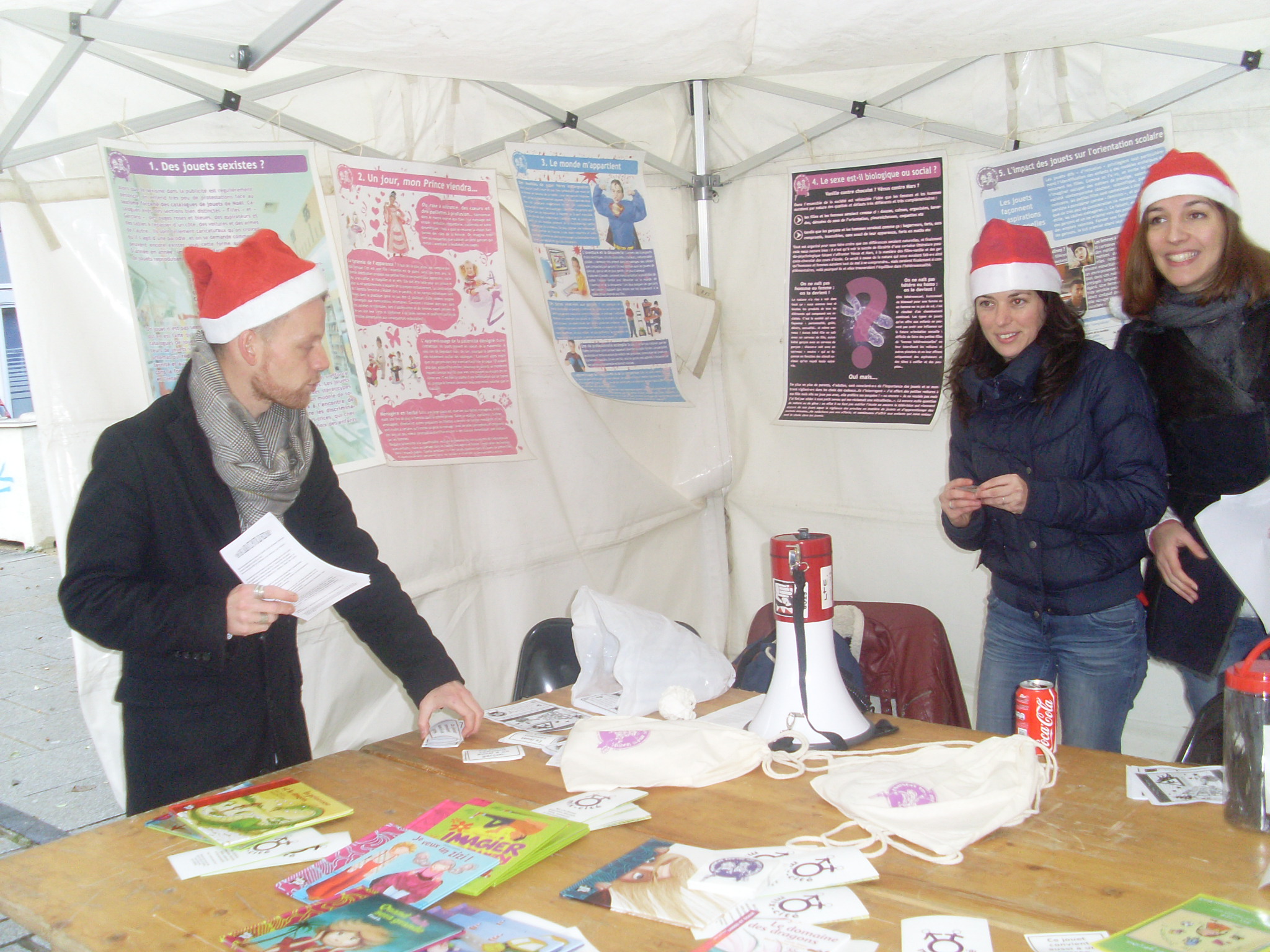 L'action festive calquée sur celles proposées dans toute bonne grande surface en décembre : distribution de bonbons et photos avec le Père Noël (ici, donc, son homologue femme) était surtout l'occasion d'engager la discussion et de présenter les outils mis à disposition par l'association pour faire réfléchir et évoluer les mentalités.